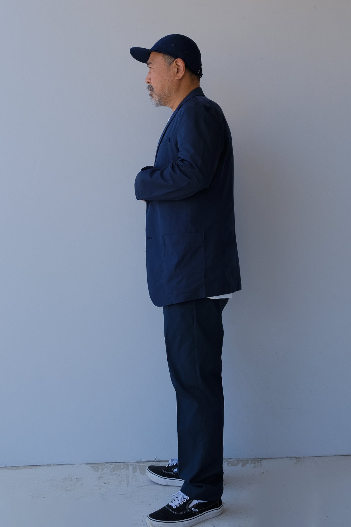 同素材のトラウザーズと合わせたセットアップスタイルでの着こなしがおすすめです。(ワーカーズ トラウザーズ)